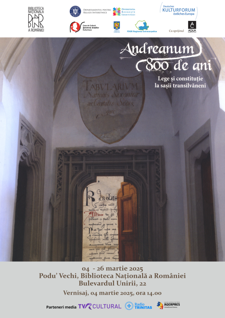 Ne face deosebită plăcere să vă invităm la vernisajul expoziției „Andreanum 800 – lege şi constituţie la saşii transilvăneni”, marți, 4 martie, începând cu orele 14:00, „Podu’ Vechi”, la Biblioteca Națională a României, Bulevardul Unirii, 22.