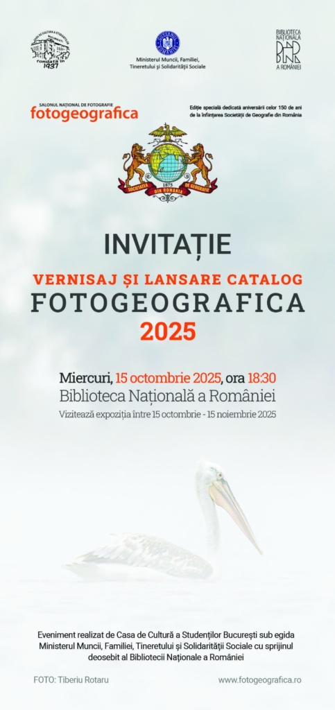 Miercuri, 15 octombrie 2025, începând cu ora 18:30, avem plăcerea să vă invităm la vernisajul Salonului Național de Fotografie „FOTOGEOGRAFICA 2025” organizat de Biblioteca Naţională a României în parteneriat cu Casa de Cultură a Studenţilor, Bucureşti.