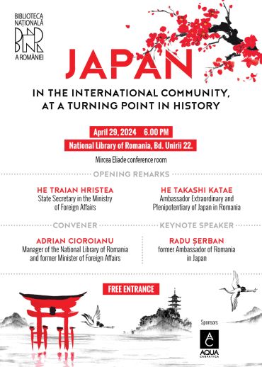 Biblioteca Națională a României vă invită la Conferința “Japan in the international community, at a turning point in history”, luni 29 aprilie 2024, de la ora 18:00, unde avem onoarea să îl întâlnim pe fostul ambasador al României în Japonia, Radu Șerban.