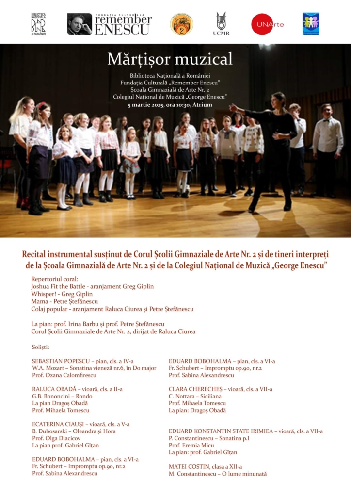 Va invităm, pe 5 martie 2025, să fiți alături de noi și de micii muzicieni de la Școala de Muzică și Arte Nr. 2 și de la Colegiul National „George Enescu” din București, ca să întâmpinăm cu bucurie și entuziasm primăvara; ora 10:30. Atrium