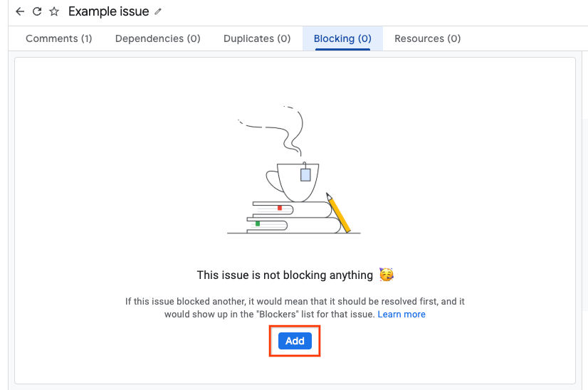系統會在「Blocking」和「Dependencies」分頁中追蹤封鎖情況。舉例來說,如果您前往問題 A 的頁面,並將其設為封鎖問題 B,則問題 A 的頁面會在「Blocking」分頁中列出問題 B,而問題 B 的頁面則會在「Dependencies」分頁的「Blockers」部分列出問題 A。