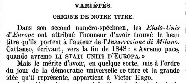 « Dans son second numéro-spécimen, les États-Unis d’Europe ont attribué l’honneur d’avoir trouvé le beau titre qu’ils portent à l’auteur de l’Insurrezione di Milano. Cattaneo [Carlo Cattaneo (1801-1869), historien, philosophe et patriote italien, a été un des leaders de l’Insurrection des cinq journées de Milan] (…)