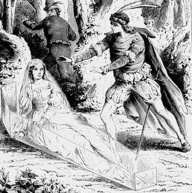 Chez Grimm, c’est le prince qui découvre et emporte son corps, mais ce n’est qu’à la faveur d’un accident que le morceau de pomme coincé dans sa gorge va sortir, lui permettant de revenir à la vie… et non pas le baiser du prince.