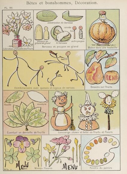 La botanique, discipline sérieuse, inspire des auteurs facétieux comme Walter Crane qui, à la fin du 19ème siècle, orne ses poèmes de personnages dont le costume évoque la plante décrite. Le caricaturiste Grandville recourt à un procédé similaire dans ses Fleurs animées. Des manuels du début du 20ème siècle expliquent aussi comment s’amuser avec les plantes à portée de main ; un gland se voit ainsi transformer en poupon. Les jouets recyclables existaient déjà il y a un siècle !