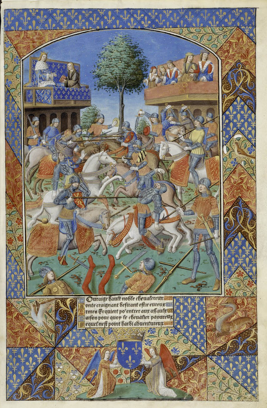 La seconde édition fut publiée en 1494 par le libraire parisien Antoine Vérard qui en fit tirer plusieurs exemplaires sur vélin destinés au roi et à des clients de haut rang. L’exemplaire de Charles VIII est le seul à contenir un feuillet supplémentaire inséré en tête du premier volume. Il comporte au recto une grande miniature représentant un combat à la lance et, dominant la scène dans une tribune, le roi à qui Vérard fait hommage de son livre.