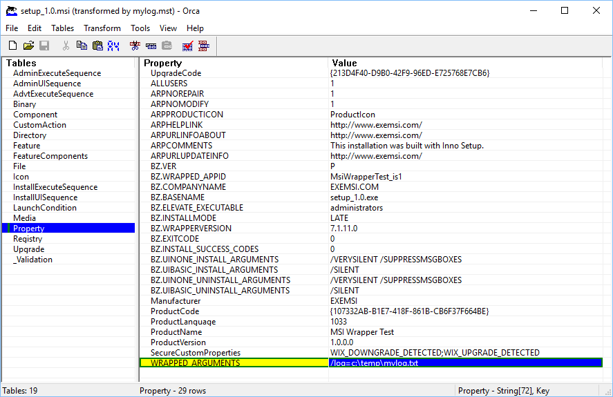 Tools such as Orca can be used to generate a MST file. The image below shows how you can add this property and insert extra command line arguments for the wrapped installer. In this example, we add a logging parameter for our test program built with Inno Setup.