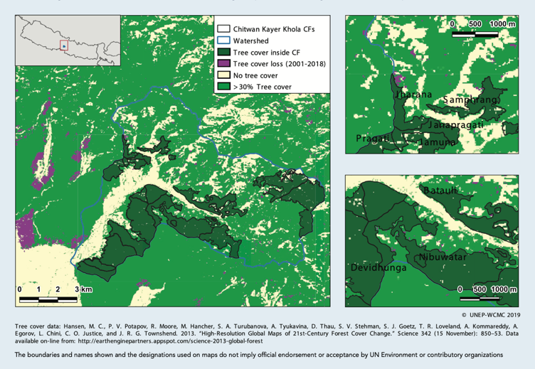 Despite numerous challenges, community forestry in Nepal has contributed significantly to poverty alleviation, community development and forest cover restoration. As just one example, Kayar Khola watershed (see Figure 1), situated in Chitwan district, covers an area of approximately 8,000 hectares, of which approximately 2,382 hectares are managed by 16 community forest user groups. A forest cover change study from 2002 to 2012 revealed that over the 10-year period, forest area increased in all 16 community forests.
