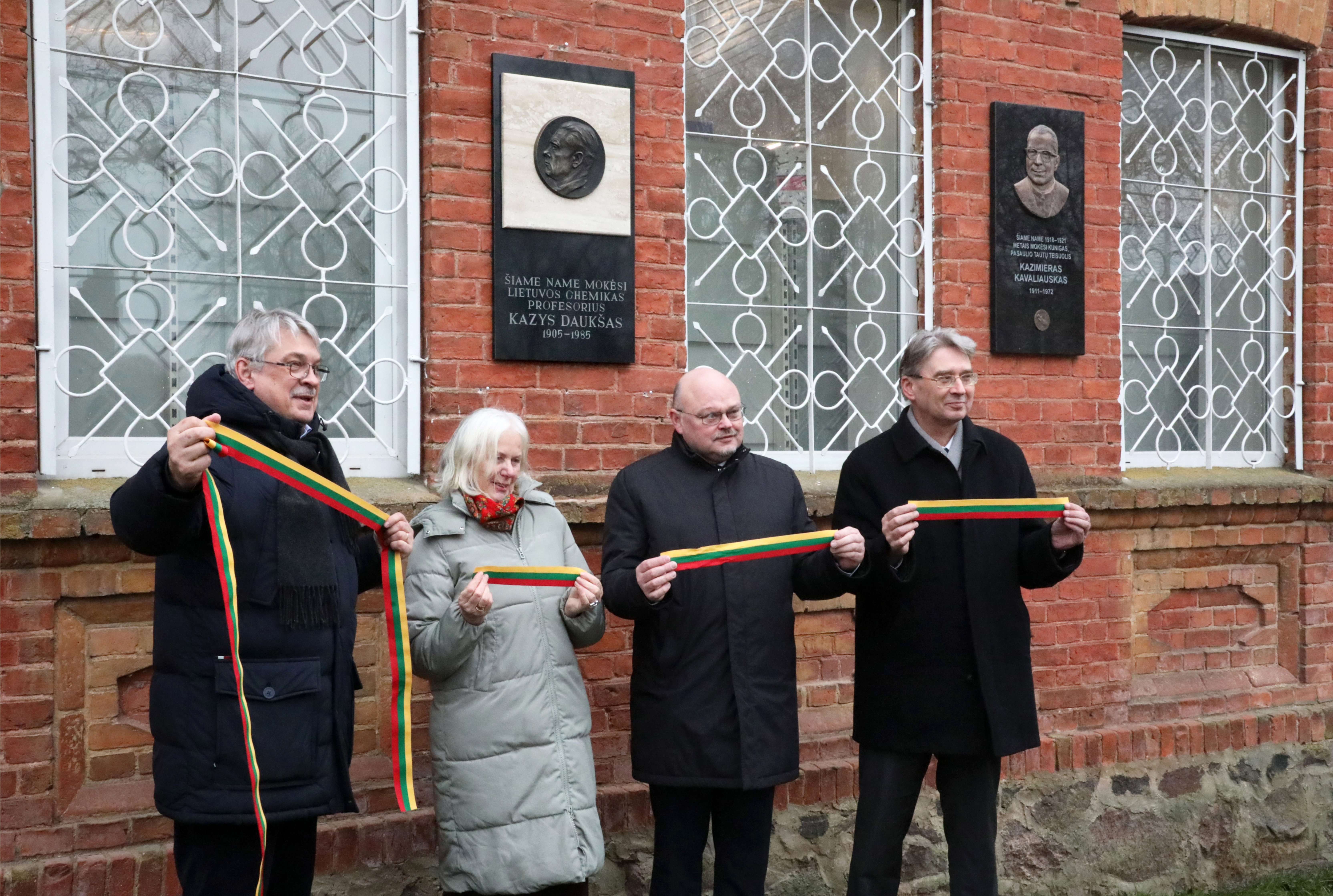 Pakruojo r. Lygumų miestelyje Kazio Daukšo atminimo lentos atidengimo akimirka. Iš dešinėsLMA prezidentas akad. Jūras Banys, Pakruojo r. savivaldybės meras Saulius Margis, akad. profesoriaus Vito Daukšos žmona doc. Emilija Udrėnaitė, akad. Aivaras Kareiva.