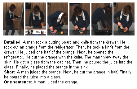 - Saarbrücken Corpus of Textually Annotated Cooking Scenes (short: TACoS) textual descriptions for MPII Cooking Composite Activities on a single level. An earlier work, with only a single level of descriptions, but additional sentence similarity annotations.