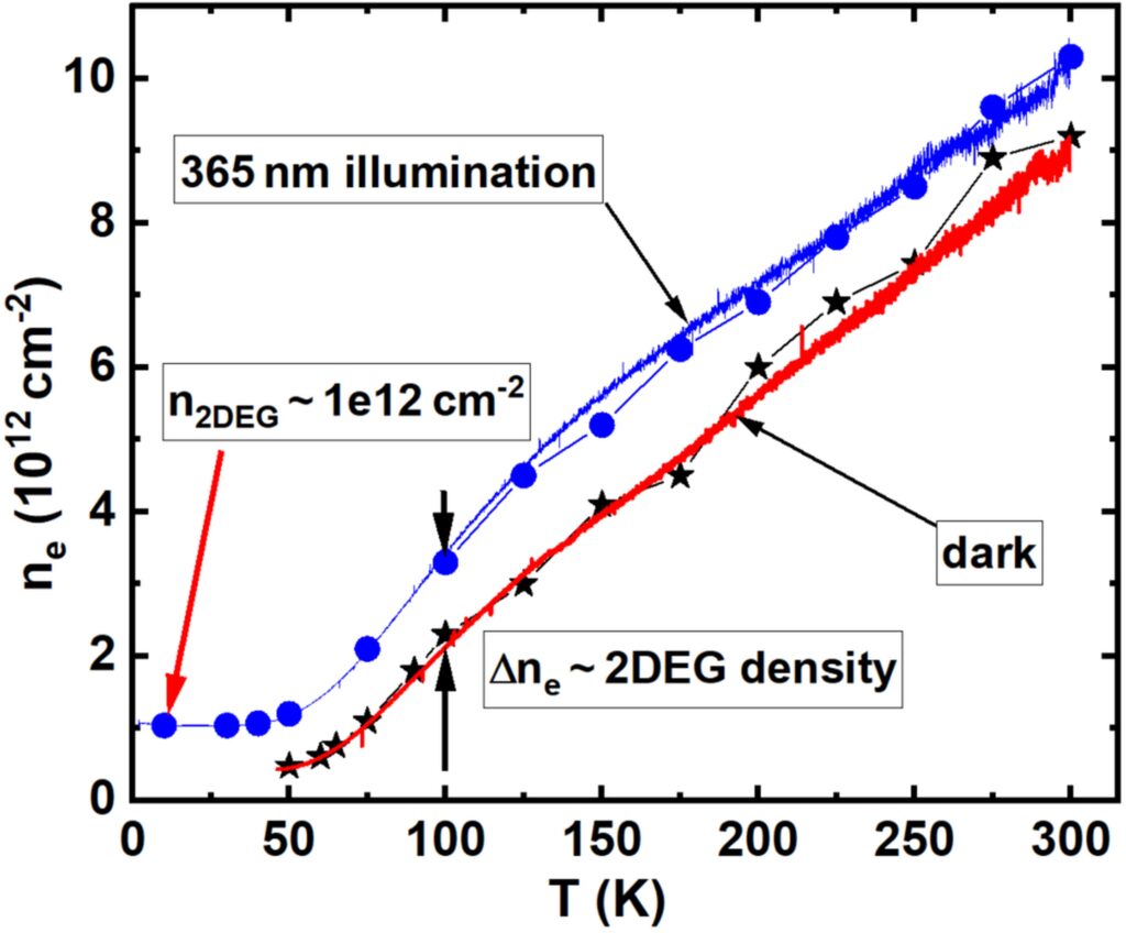 GaN/AlGaN stacks hosting a two-dimensional electron gas (2DEG) are the prerequisite for lateral field-effect transistor (FET) operation. Parasitic conduction paths in these stacks deteriorate FET performance, since the 2DEG cannot fully be depleted and thus the transistor cannot be turned off. Parasitic conductivity results from silicon at the substrate/MBE interface and originates from the adhesion of particles when the substrate is exposed to ambient atmosphere prior to loading for the subsequent overgrowth. Silicon acts as a shallow donor in GaN and the resulting free charges could in principle be compensated by a deep acceptor. In the present case, a carbon layer at the substrate/MBE interface was introduced to compensate the parasitic conductivity. It was shown that at low temperature the 2DEG is the only conducting channel and any parasitic conduction path was suppressed (Fig. 2). In this specific layer stack, the 2DEG is only present under illumination with ultra-violet (UV) light. Thus, magneto-transport measurements performed in the dark and under UV exposure allow for the separation of the density contribution from the 2DEG and the parasitic channel. Further it was demonstrated, that the density difference in the dark and under UV exposure is constant over the entire temperature range and thus the 2DEG density does not depend on the temperature.
