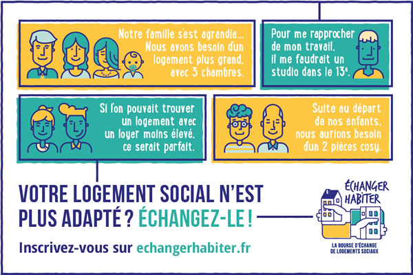 En Île-de-France, près d’une demande de logement social sur trois est faite par un ménage déjà locataire du parc social. Pour répondre à cette attente de mobilité, les acteurs franciliens du logement social se mobilisent et vous proposent une solution innovante : la plateforme Échanger Habiter. Cette bourse d’échange de logements sociaux vous ouvre la possibilité d’accéder directement à de nouvelles offres de logement. En vous inscrivant sur le site, vous devenez acteur de votre parcours résidentiel. Renseignez vos critères de recherche et la plateforme sélectionnera les annonces de locataires avec lesquels l’échange est envisageable.