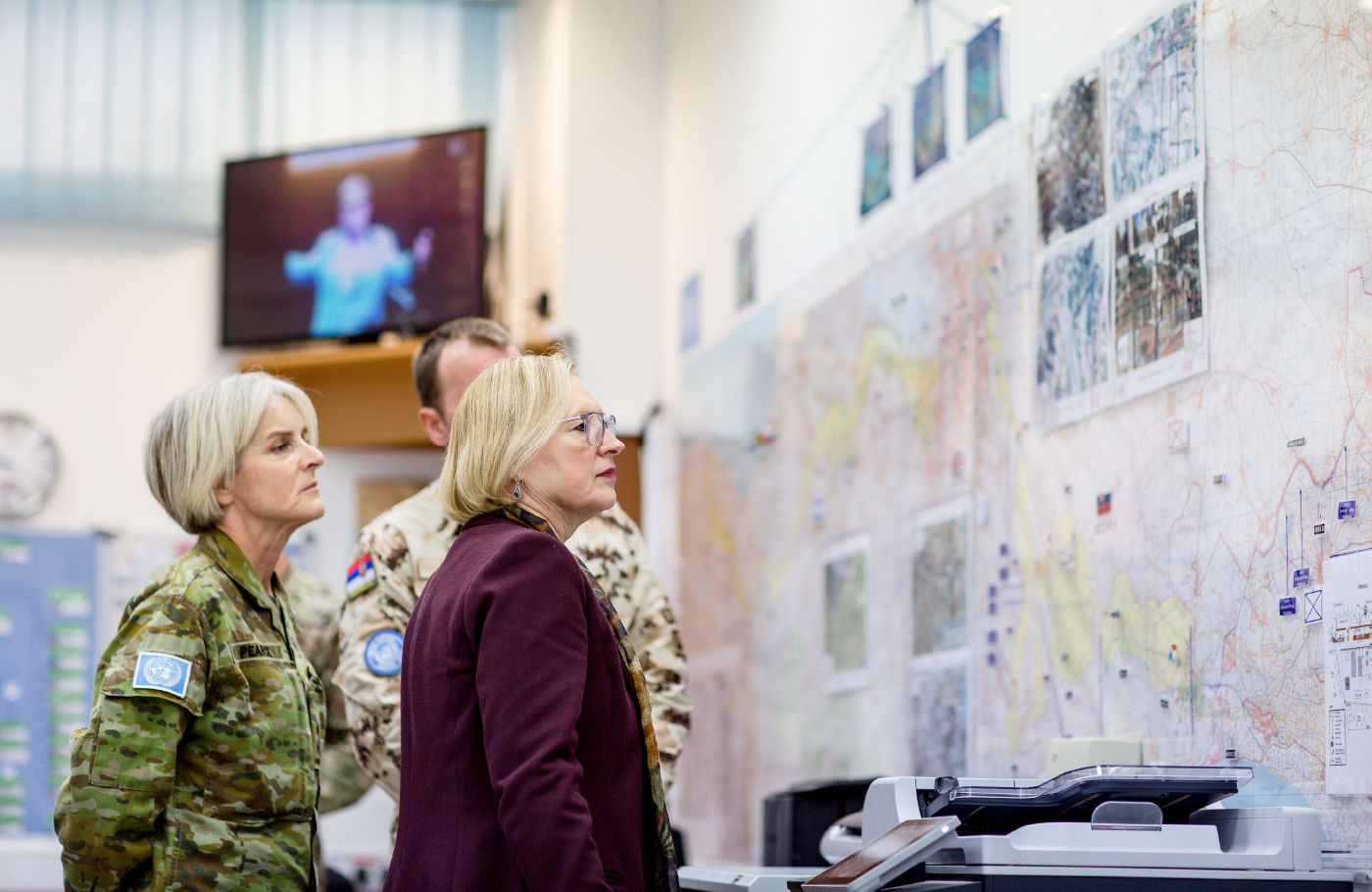 The United Nations Peacekeeping Force in Cyprus (UNFICYP) was the first mission to have women simultaneously leading its civilian, military and police components. Here, the Special Representative of the Secretary-General in Cyprus and Head of UNFICYP, Elizabeth Spehar, and Force Commander Major General Cheryl Pearce, review the mission's deployment maps.
