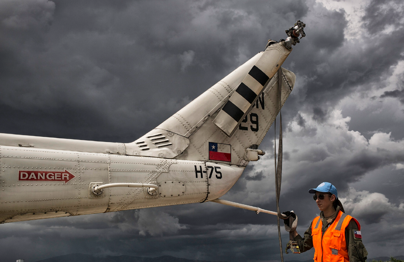 Air assets play a key role in helping to implement mission mandates in some of the vast countries and rugged terrain in which the UN operates. In recent years, the number of women peacekeepers serving in aviation units has increased, including pilots, crew and maintenance staff. Here, a member of the Chilean aviation unit with the UN Stabilization Mission in Haiti (MINUSTAH) readies an aircraft for takeoff.