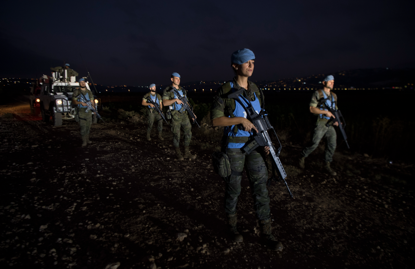 Enhanced patrolling by the UN Interim Force in Lebanon (UNIFIL) has helped keep the peace in the south of the country. Here, a Spanish peacekeeper patrols at night along the Blue Line on the outskirts of Kafar Kela.
