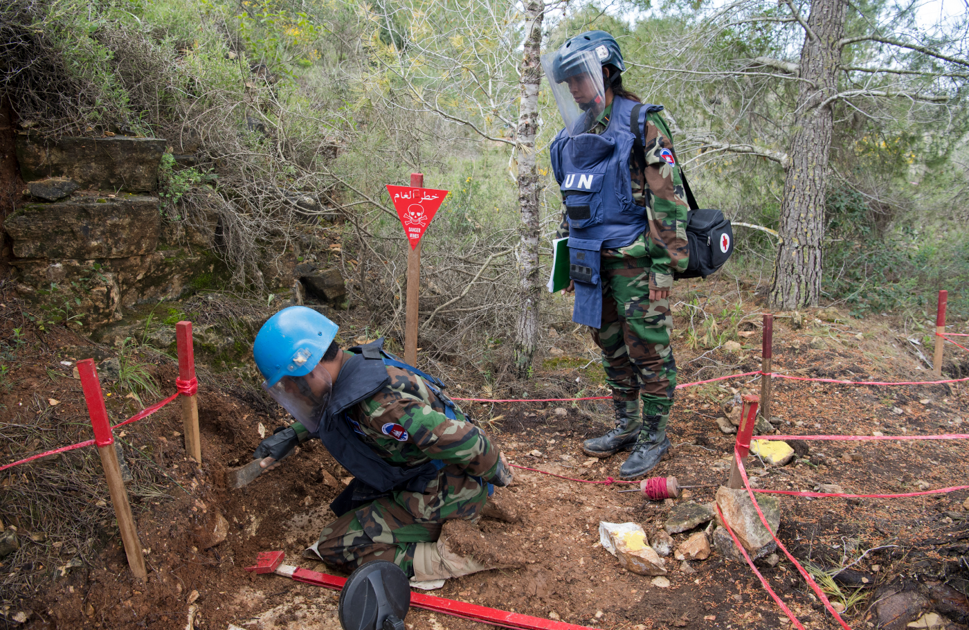 Cambodia is a country that faces many challenges due to landmines, a legacy of three decades of war. In response, the country has developed a large cadre of mine-clearance experts. For the past two decades, Cambodian experts have served as military or civilian deminers in several UN peacekeeping operations. Here, a Cambodian demining team deployed with the UN Interim Force in Lebanon (UNIFIL) works in a mine field near the Blue Line, in the vicinity of Yaroun, south Lebanon.