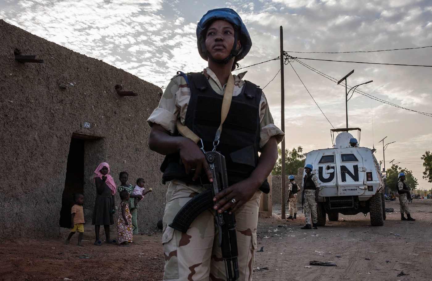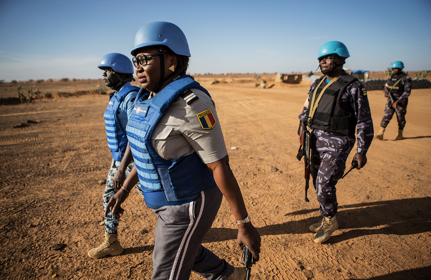 The region of Menaka, Mali, has experienced insecurity as a result of attacks by extremist groups and other armed elements. Peacekeepers from the UN Multidimensional Integrated Stabilization Mission in Mali (MINUSMA) help protect and secure the civilian population. Here, a Chadian police officer and her colleagues carry out a foot patrol.
