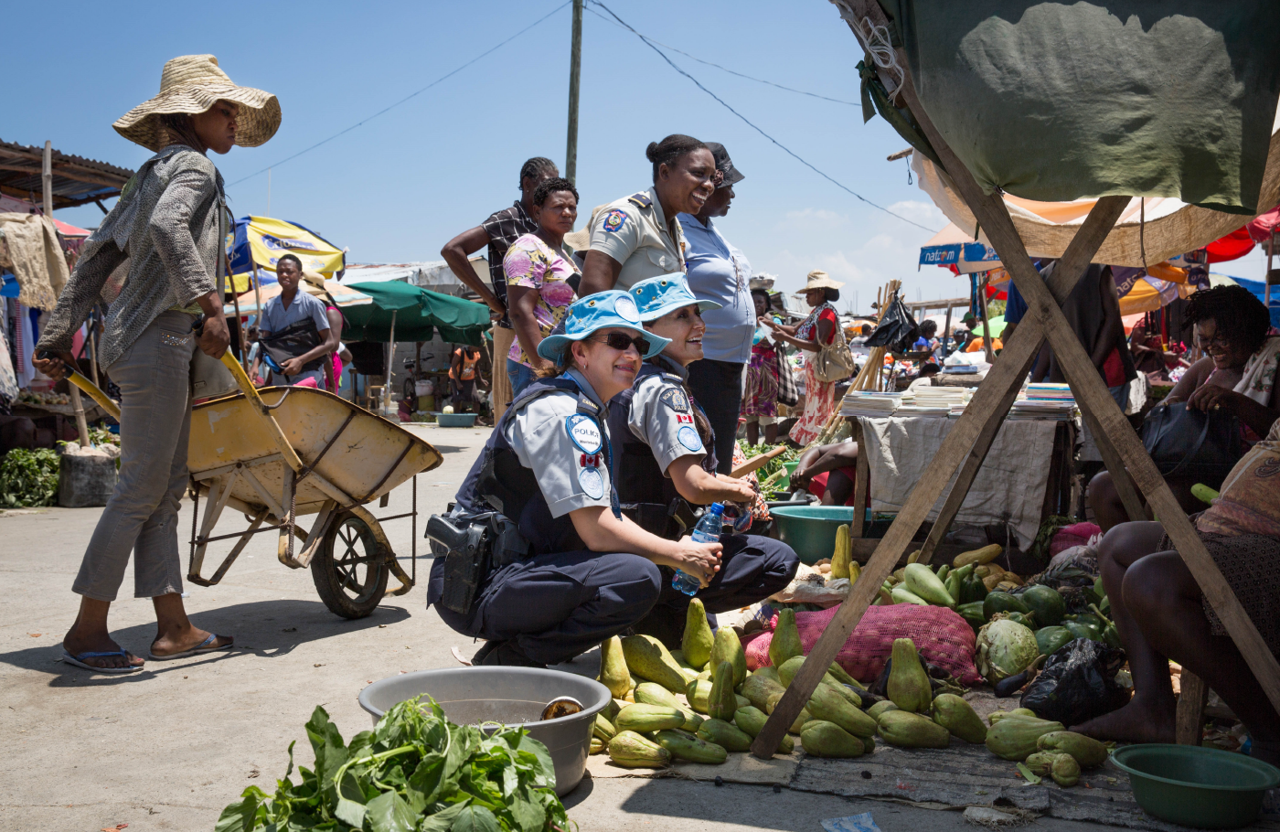 UN Police officers played a major role in a community engagement campaign in Haiti to sensitize the population about the UN's zero tolerance policy towards sexual exploitation and abuse. Here, two UN Police officers from Canada and their Haitian police counterparts speak with women in a busy market in the capital Port-au-Prince to inform them about the existing channels to report allegations of misconduct.