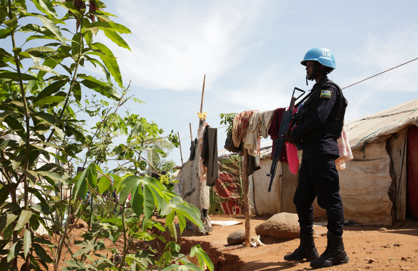 Protecting civilians is one of the primary tasks of UN Peacekeeping. When the local population fled violence in South Sudan, many sought shelter at UN bases. In response to the large number of civilians who arrived at UN premises throughout the country seeking shelter and protection, the UN Mission in South Sudan (UNMISS) set up ‘Protection of Civilian' sites (POCs). Here a member of the Rwandan Formed Police Unit protects the perimeter of a POC site.