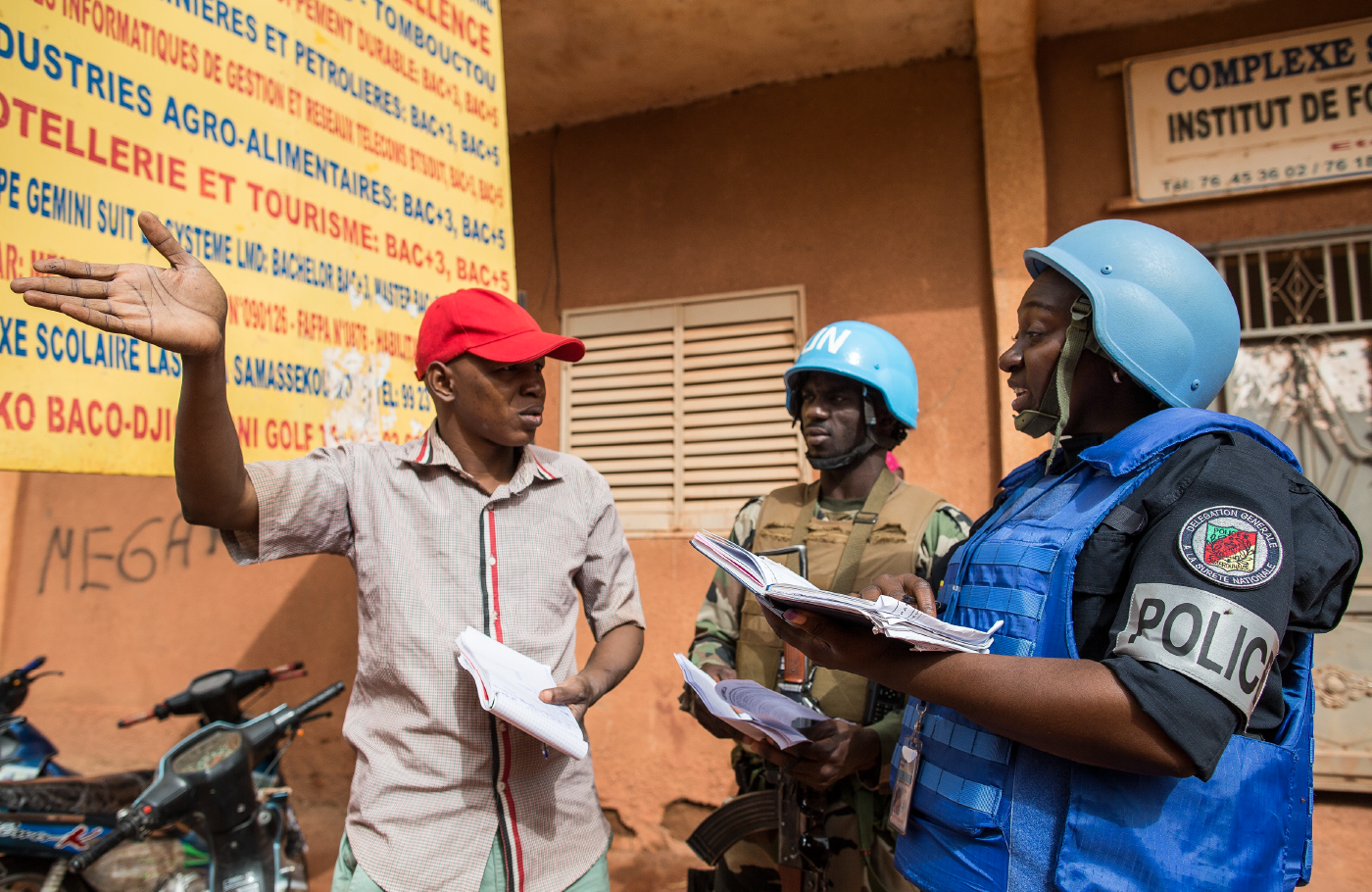 To ensure the security of Mali's Presidential election in July 2018, the UN Mission in Mali, MINUSMA, deployed a military and police presence throughout the country. Here, a UN Police officer from Cameroon talks with a local official outside a polling station in Mopti.