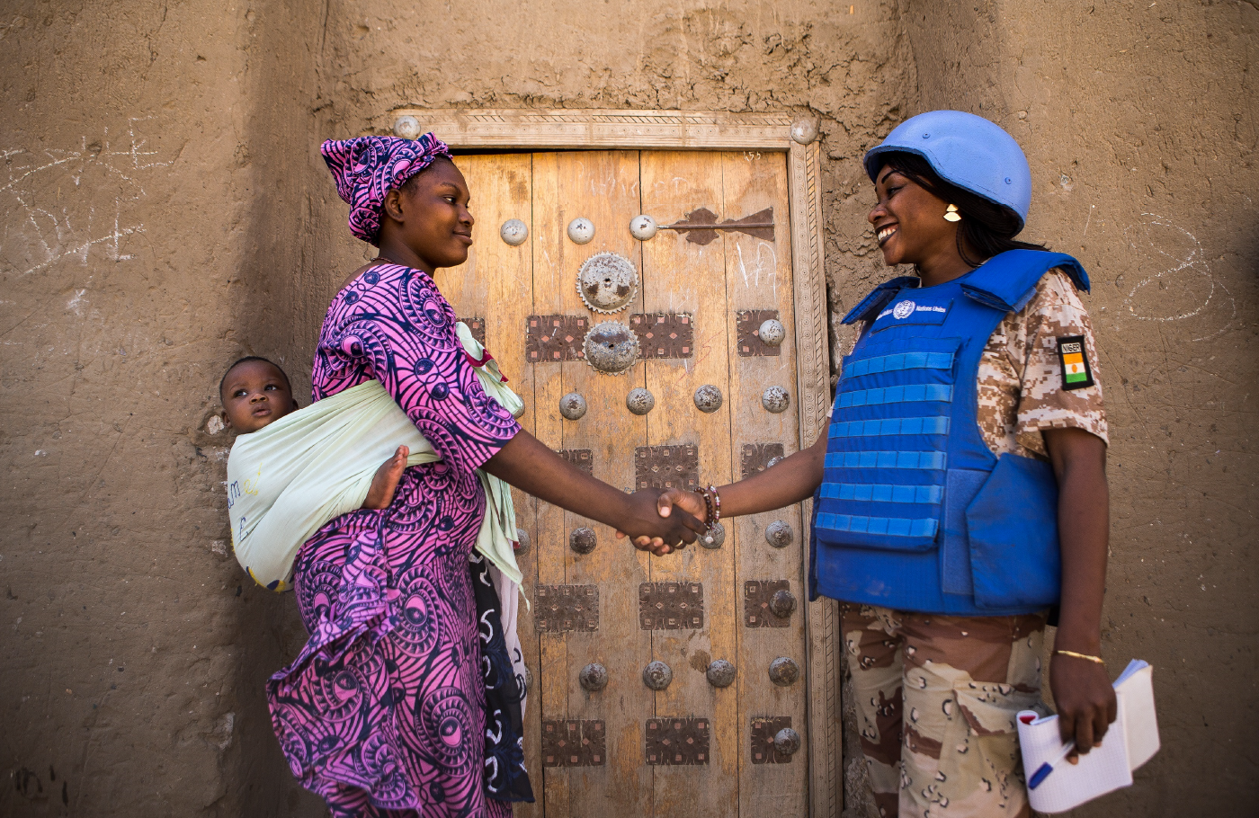 United Nations Police (UNPOL) Officers carry out frequent patrols in Timbuktu, Mali, to secure the city against threats of terrorism and armed conflict. Here, an UNPOL officer from Niger greets a woman while on patrol in the city.